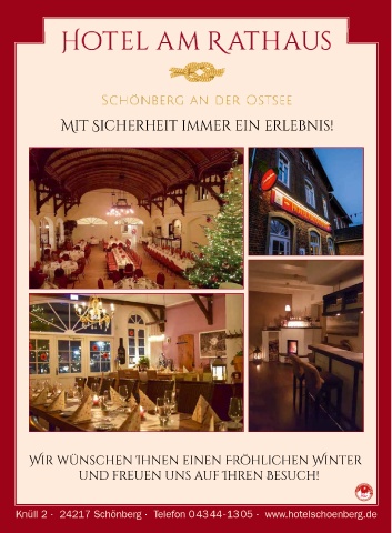 Hotel & Restaurant „Am Rathaus“ · Knüll 2 · 24217 Schönberg Telefon 0 43 44 - 13 05 · Fax 0 43 44 - 41 58 00 info@hotelschoenberg.de · www.hotelschoenberg.de Knüll 2 · 24217 Schönberg · Telefon 0 43 44 - 13 05 · www.hotelschoenberg.de 2