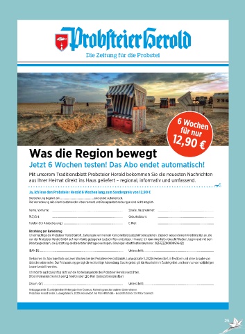 Sie können Ihr Abo innerhalb von zwei Wochen bei der Probsteier Herold GmbH, Ludwigstraße 5, 24226 Heikendorf, in Textform und ohne Angabe von
