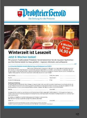 Sie können Ihr Abo innerhalb von zwei Wochen bei der Probsteier Herold GmbH, Ludwigstraße 5, 24226 Heikendorf, in Textform und ohne Angabe von